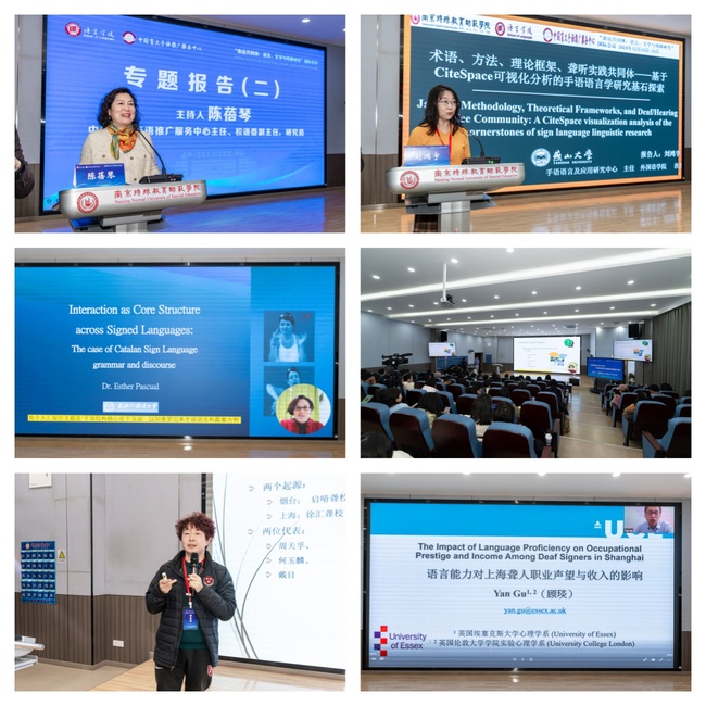 会议的第二场专题报告由中国盲文手语推广服务中心主任陈蓓琴研究员主持。燕山大学手语语言及应用研究中心主任、外国语学院教授刘鸿宇教授以如何更好地发展手语语言学,解决现实需要为研究背景,重点介绍了CiteSpace(科学引文空间)这一方法论及其应用,从话语体系、理论框架、研究方法等指出当今手语语言学的研究基石,重点提出“聋听实践共同体、普特高教共同体”是手语语言学研究不可缺少的基础。《国际语言与文化》主编、上海外国语大学副教授帕斯夸尔(Esther Pascual)以加泰罗尼亚手语中的“是否问句”结构为例,研究手语表达条件性从句、连接性从句、非标记焦点和限制性关系等语法现象。指出手语中的很多表达都源于社群中人们口语的多模态表达,逐渐演变成为手语的疑问标记,进而上升为手语语法的一部分。伦敦大学顾琰副教授的报告调查了上海聋人的手语能力对其就业、职业声望、收入水平的影响,为手语和职业的关联性研究提供了新的有力证据。上海外国语大学副研究员林皓的报告介绍了烟台、上海两地聋校起源与发展,指出中国早期聋校创办者周天孚以及中国第一个全国性聋协主席何玉麟对中国聋校和手语发展的重要贡献。