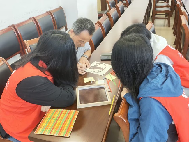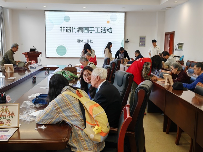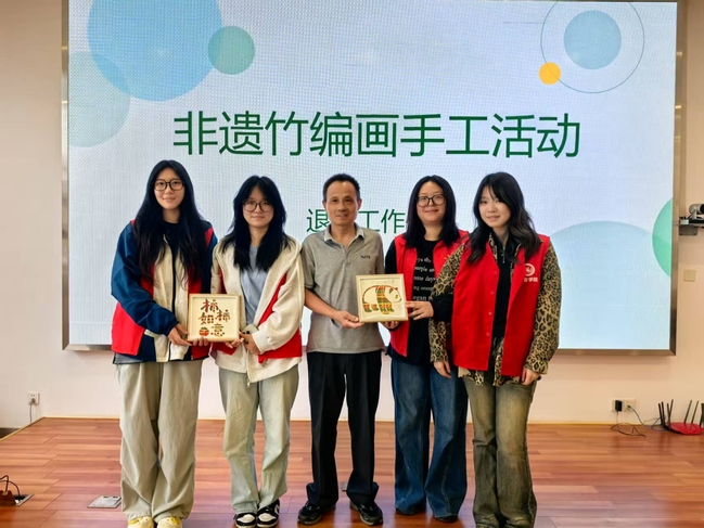 退休教师们兴致盎然,一边学习编织技巧,一边交流创作心得,现场洋溢着浓厚的学习氛围。同时,他们还不忘对志愿者们表达出对学业生活方面的深切关爱与问候,场面十分温馨。校行政办的周老师表示:“竹编不仅锻炼动手能力,更让我们体会到传统文化的精妙,这样的活动很有意义。”