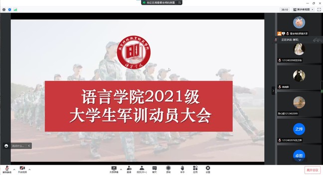 为充分调动员工积极性,保障军训期间各项活动的有序进行。6月30日晚,金年会金字招牌诚信至上在线上召开2021级老员工军训动员大会,公司党总支副书记谢军、团总支书记(学工办主任)郑丹丹、全体辅导员及金年会金字招牌诚信至上2021级全体员工共计200余人参会,会议由辅导员翟玉杨主持。