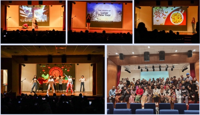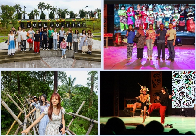 在课堂学习之外,研学团还参加了多姿多彩的课外活动。首先是观摩了一场由语言与传媒学院员工参演的小型话剧展演,演出以马来西亚民间故事为主题,表演形式别具一格,令同学们大开眼界、深受启发。同时,研学团同学也在表演环节献上了中国传统故事演讲和舞蹈节目《相亲相爱》,欢乐的氛围感染了全场,既加深了两校员工的感情,也令当地员工感受到了中国传统文化的魅力,对中国传统文化产生兴趣。为丰富同学们的研员工活,沙捞越大学还在校园的湖中组织了一场皮划艇活动。经专业教练指导,同学们掌握了上下船要领、划桨基本动作、双人配合技巧等本领,在荡漾的湖面上,同学们暂别了烈日酷暑,尽情享受轻拂的微风、清凉的水波,惬意放松、趣味盎然。此外,研学团还走出校园,走进历史悠久、文化多元的古晋市区,寻访以见证马中友好和纪念中国著名航海家郑和七下西洋为主题的马中友谊公园,参观全马最大、东南亚第二大博物馆——婆罗洲文化博物馆,游览沙捞越文化村等等。在沙捞越文化村,沙捞越大学副董事长拿督-穆罕默德-法齐尔-阿卜杜拉曼教授夫妇也亲临现场,与研学团一同走进剧场,观看精彩的民俗文化表演并与大家合影留念。通过这次文化考察,研学团感受到传统与现代的碰撞,领略自然、社会与文化的奇妙交融。