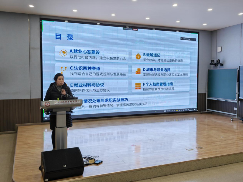 郑丹丹老师结合自身在学校就业指导中心积累的宝贵工作经验,为同学们带来了深入且实用的指导与帮助。她围绕就业心态建设、破解就业迷茫、认识不同就业赛道、城市与职业的合理选择以及个人档案管理等重要方面,展开了全面且细致的讲解。郑老师着重强调,毕业生们要以实际行动打破内心的焦虑与内耗,树立积极向上的求职心态。同时,她还详细解读了就业协议书、劳动合同以及五险一金等相关知识,提醒同学们高度重视并妥善保管个人档案。会议尾声,郑丹丹老师以一句饱含深情与力量的话语——“普通人的精气神来源于劳动,用双手和智慧创造财富才是最养人的”作为寄语,真诚地祝愿同学们在未来的人生道路上前程似锦、万事顺遂。
